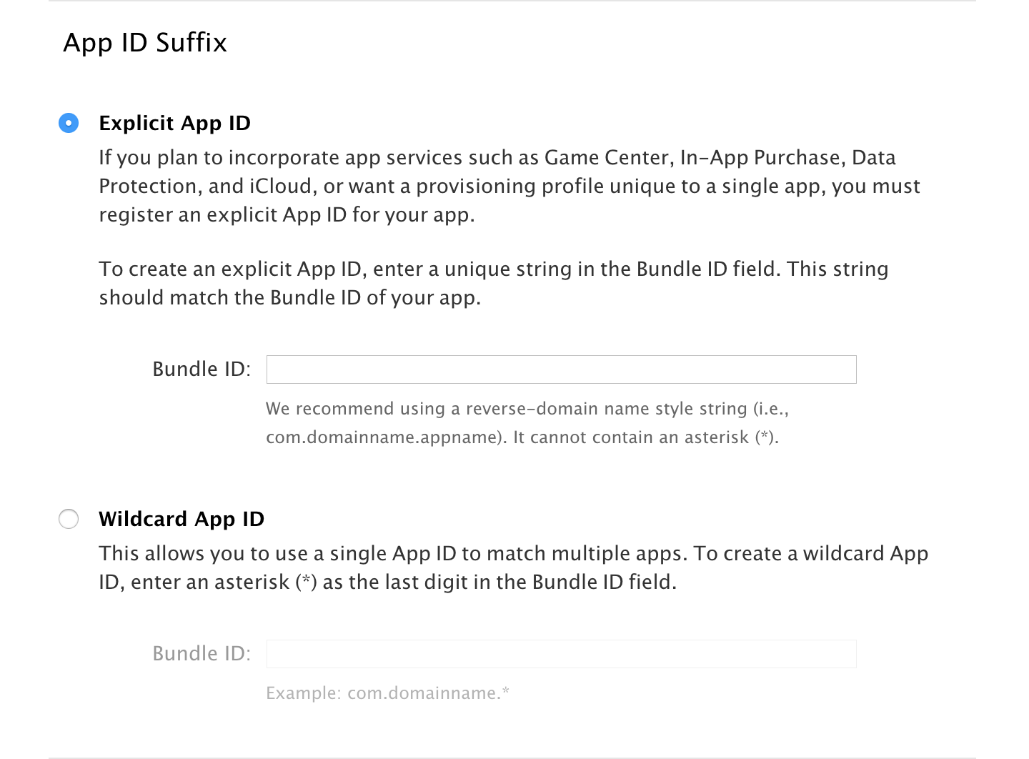 嗯,一般来说建议用第一个,如果你需要用到Game Center,app内购,数据保护,iCloud,那只能用第一个。第二个通配的App ID可以用,但是并没有什么益处,至少我还没有遇到过必须要用第二个的情况。所以,选第一个吧,把你xcode里面的Bundle ID写进去就好了。