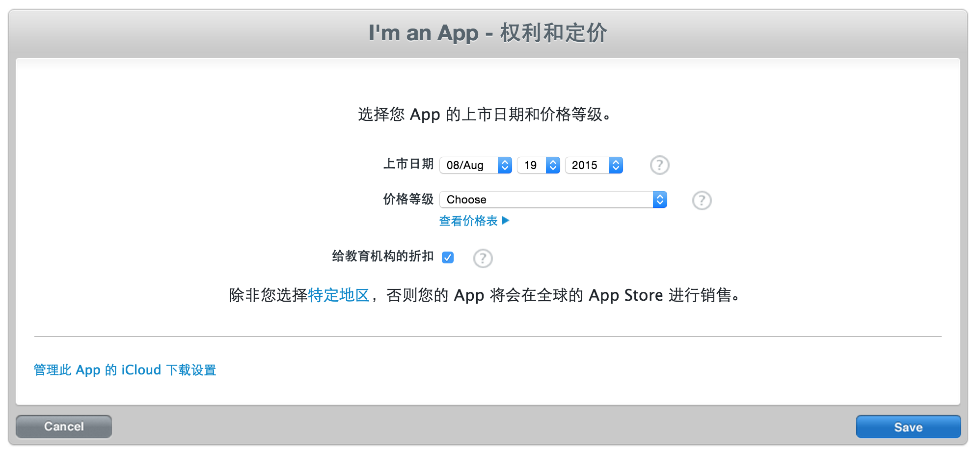 请选择一个定价吧,请参考查看价格表,价格定完后保存,退出我的 App,好了,上架完成了,嗯。开个玩笑,app文件都没上去呢!