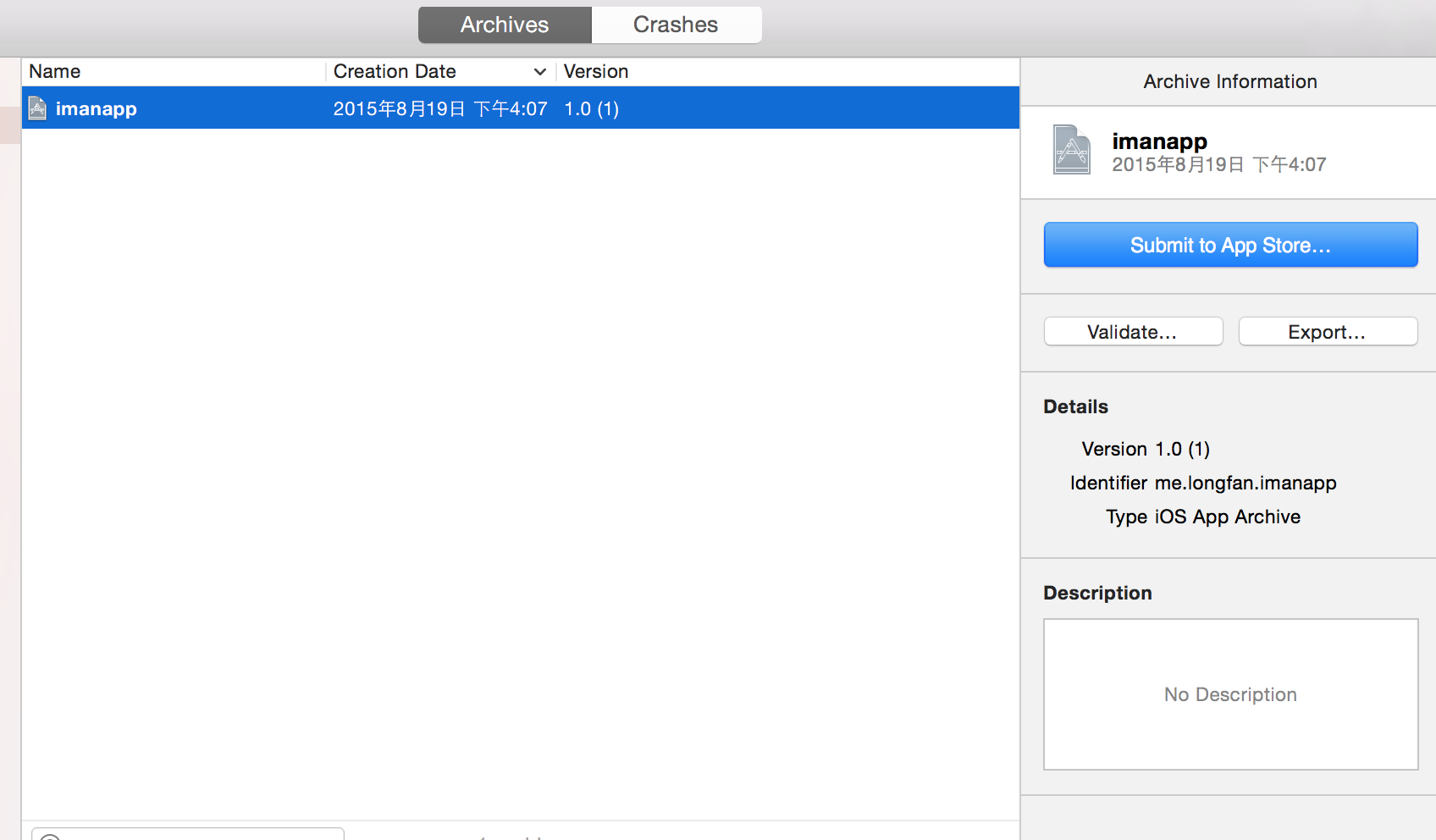 如果之前的操作都无误的话,等validate成功后(当然这只是一个演示,重要的事情说三遍,要有图标,要有图标,要有图标!),点击左边蓝色按钮Submit to App Store...,经过相同的选择和一些等待后,我们编写的ipa就上传到了Apple的服务器中。